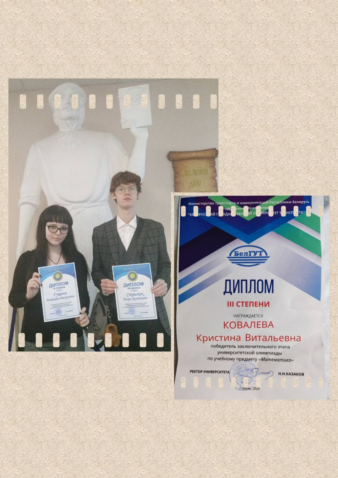 🚂 Еще одна часть выпускников 11-го класса побывала в Белорусском государственном университете транспорта. Здесь чествовали знатоков точных наук. Наша учащаяся Ковалева Кристина стала одной из лучших на университетской олимпиаде по математике.🥉Умница, так держать!